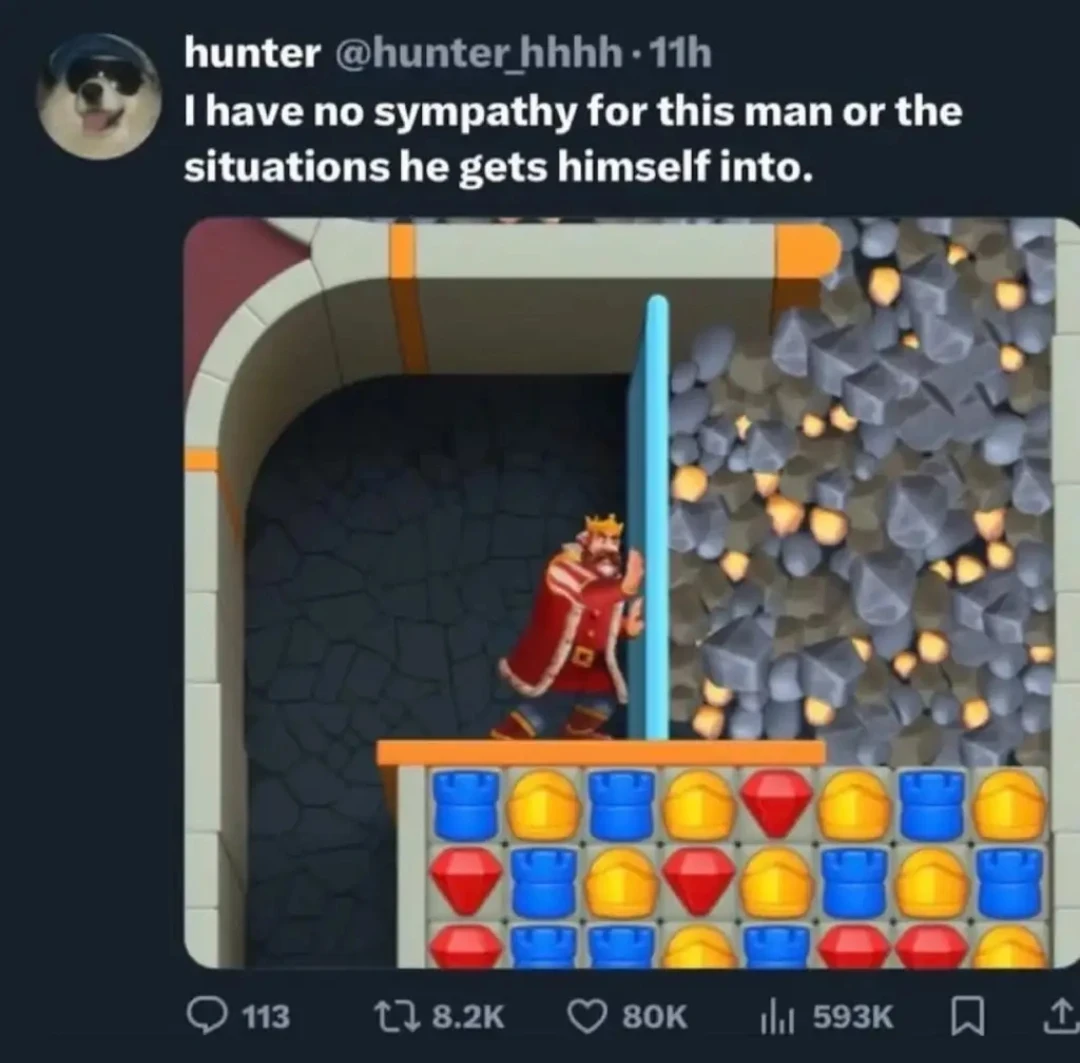 Have you ever seen those ads? You know the ones. The king is pushing a wall, there are rocks flowing down a pipe and slowly pushing him back, but only you can save him, by playing match 3?